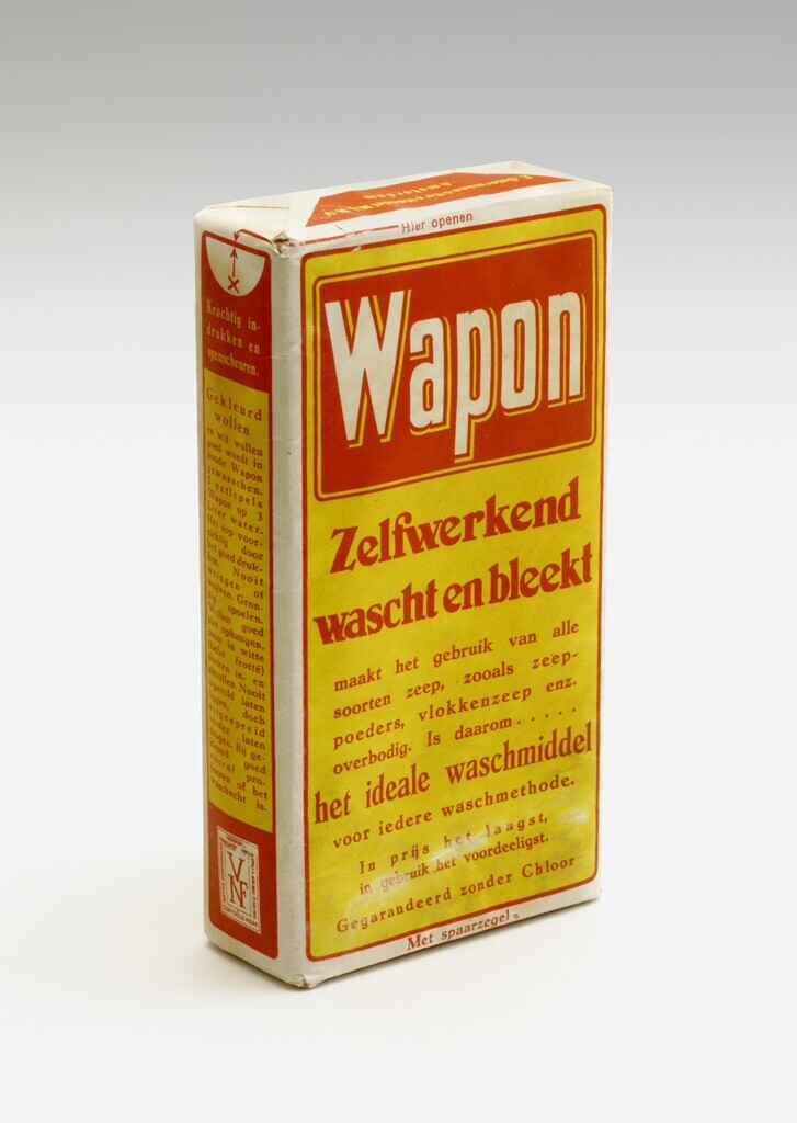 Een pak wasmiddel 'Wapon Zelfwerkend Wascht en Bleekt'.
