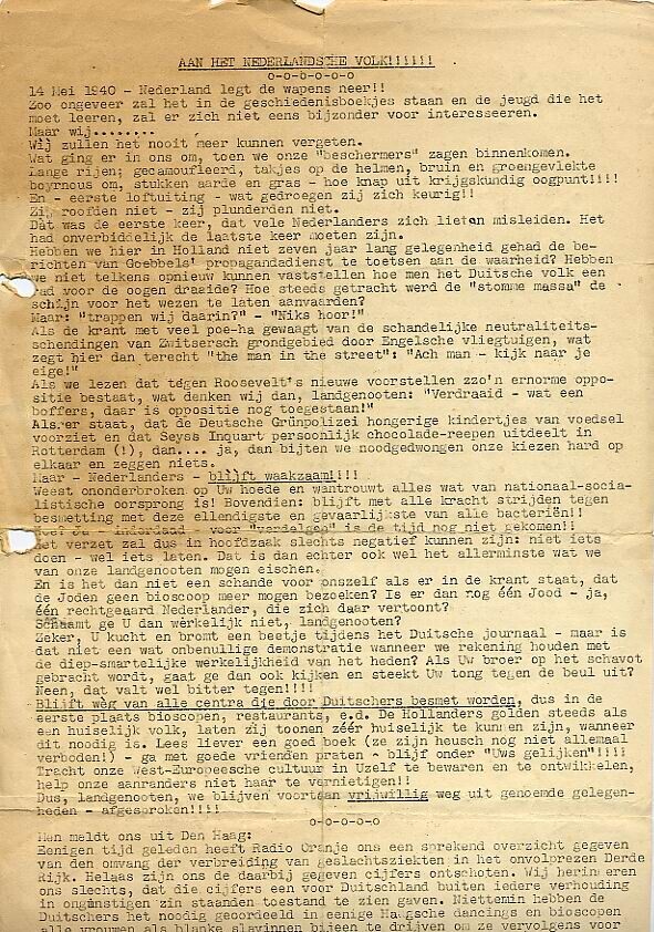 Gestencild dubbelzijdig met een oproep om alles te wantrouwen "wat van nationaalsocialistische oorsprong is" en weg te blijven van "alle centra die door Duitschers besmet worden, dus in de eerste plaats bisocopen, restaurants, e.d." Verder een vergelijking tussen Napoleon en Hitler: "1814: Assez de Bonaparte! 1941: Genug von Hitler!"