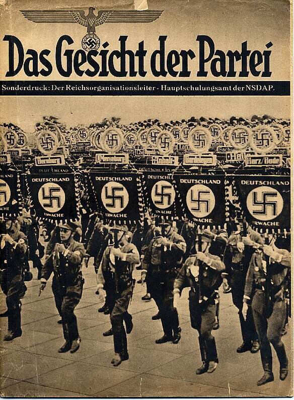 Een geïllustreerde uitgave 'Das Gesicht der Partei' over de NSDAP met op de voorkant een foto van een parade met militairen die vaandels dragen met een hakenkruis en de tekst: "Deutschland erwache". Op de achterkant tekst en muziek van het lied "Heilig Vaterland".
