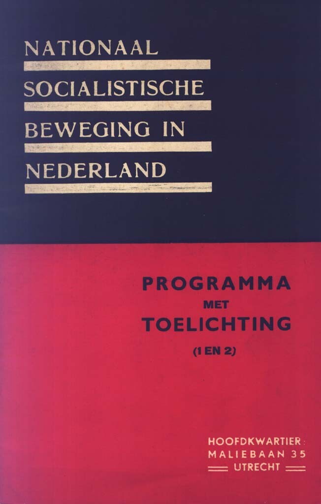 Partijprogramma van de N.S.B. De kaft is in rood zwart uitgevoerd en bevat de tekst: "Nationaal-Socialistische beweging in Nederland - Programma met toelichting 1 en 2.