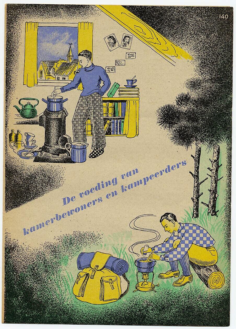 Folder met recepten en tips, uitgegeven ter bestrijding van de slechte eetgewoonten van kampeerders en kamerbewoners. Op de voorkant een man, kokend op een fornuis midden in een kamer en een kampeerder roerend in een pan op een petroleumstel.