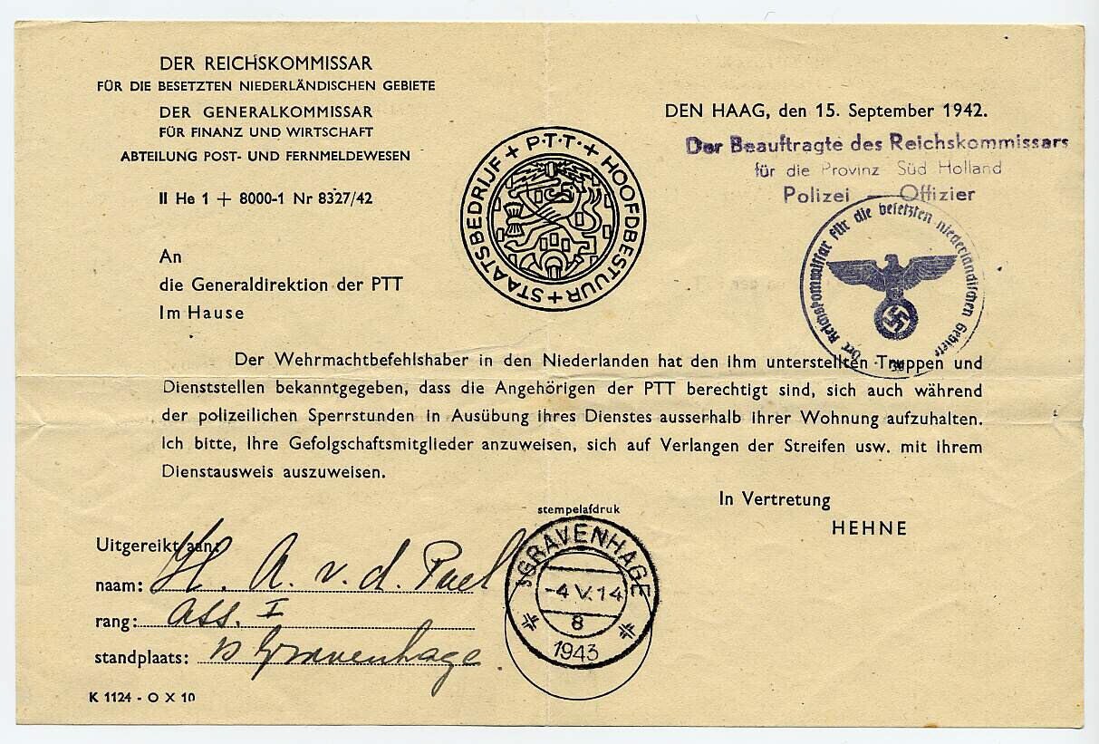 Een tweetal in het Duits gestelde documenten waarmee aan H.A. van der Poel - werknemer van de PTT - toestemming wordt gegeven zich ook tijdens de avondklok op straat te begeven.