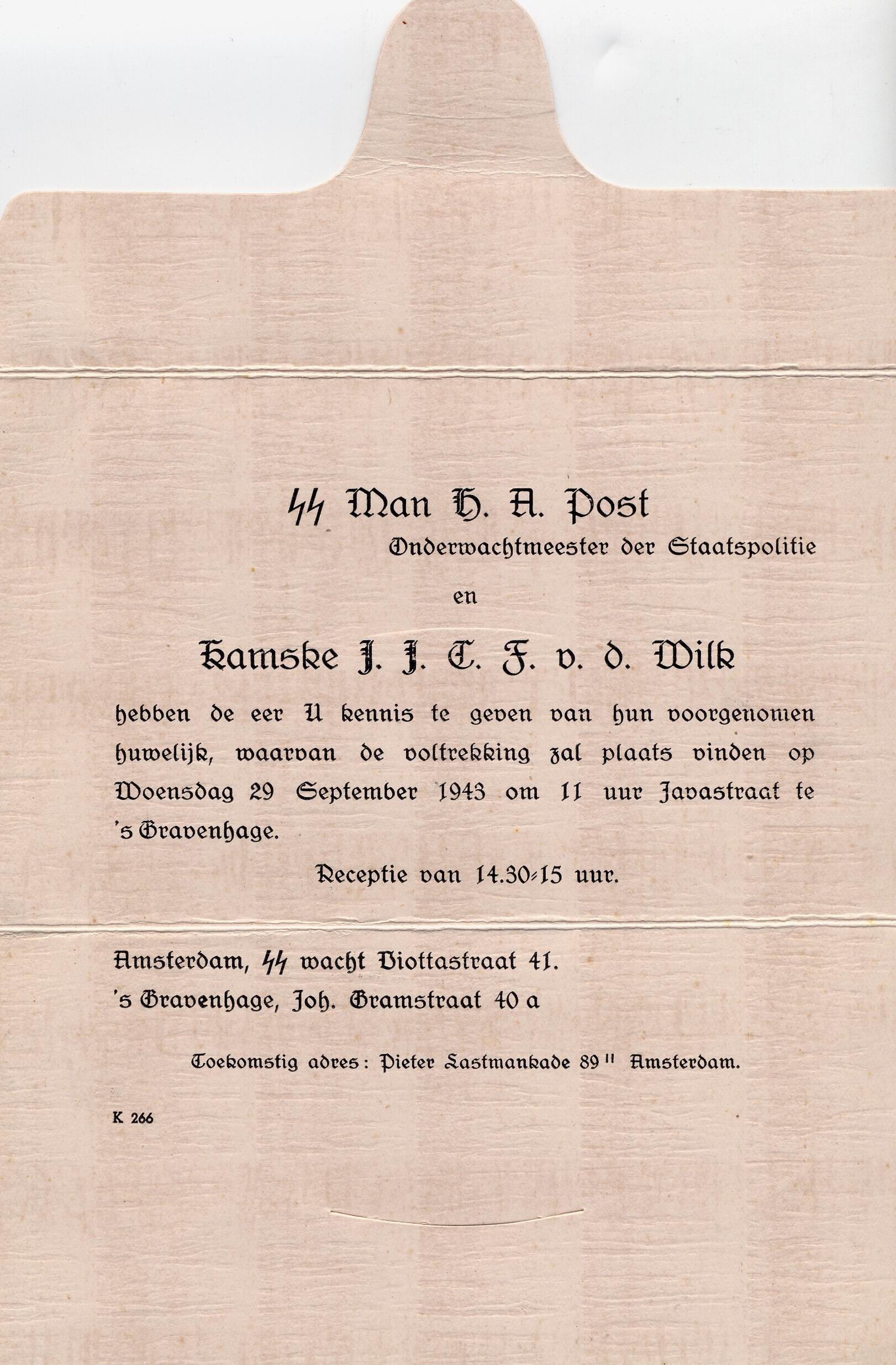 Geadresseerde en gefrankeerde kaart waarin het huwelijk wordt aangekondigd van SS Man H.A. Post met Kamske J.J.C.F. v.d. Wilk op 29 september 1943 in Den Haag.