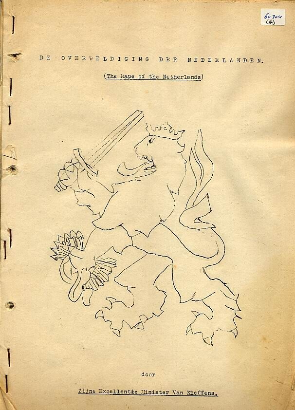 Nederlandse vertaling van "The rape of the Netherlands' van Minister Van Kleffens. Gestencilde, illegale uitgave. Op de voorkant de Nederlandse Leeuw. De uitgave omvat 59 pagina's.