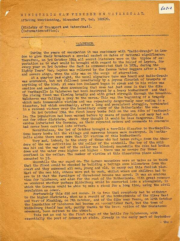 Engelstalig document, bestaande uit twee vellen papier en opgesteld door de afdeling voorlichting van het Ministerie van Verkeer en Waterstaat over de schade aan de Walcherse dijken en het herstel ervan na afloop van de Tweede Wereldoorlog.