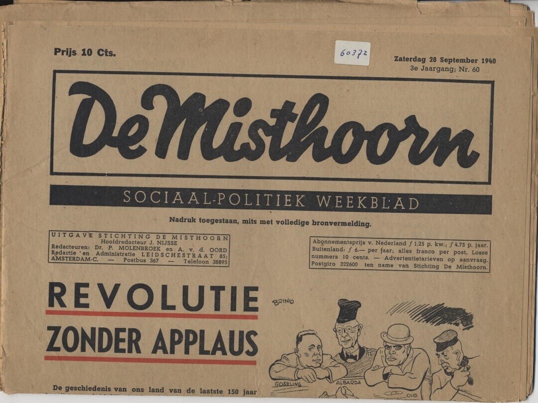 Editie van "De misthoorn. Sociaal-politiek weekblad" jaargang 3 nummer 60 van 28 september 1940.