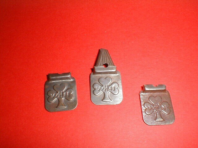 Drie blikken badges met het logo van de Winterhulp Nederland in de vorm van een klaverblad met daarop de letters "WHN". De badge is rechthoekig met afgeronde hoeken en voorzien van een driehoekig klipje data aan de achterkant gekarteld is. Deze badges werden gedragen door de collectant.