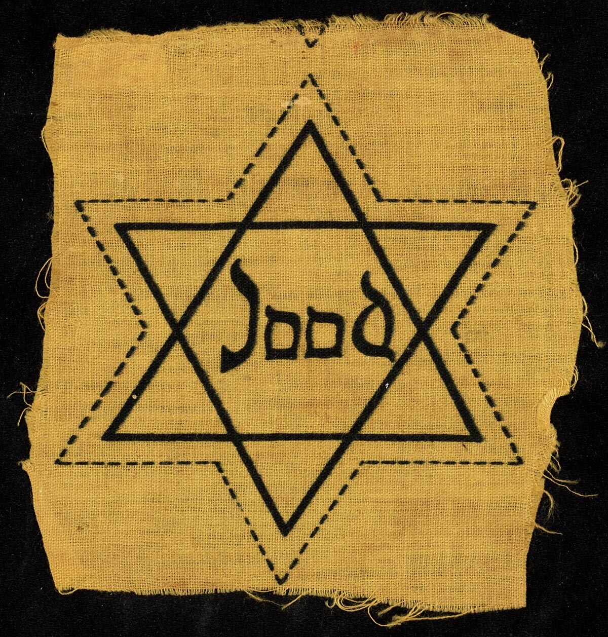 Stukje gele katoen met daarop een - onuitgeknipte - Davidster met in het midden het woord: "Jood".