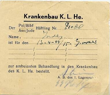 Duitstalig formulier met als titel "Krankenbau K.L. He." (= Konzentrationslager 's-Hertogenbosch), waarop staat vermeld dat de heer Inden op 13-4-'44 een afspraak in het ziekenhuis heeft.<br>Er worden vier categorieën gevangenen vermeld: Pol/Bibf/Aso/Jude (= politiek gevangene / Bibelforscher, Jehovagetuige / asociaal element / jood).