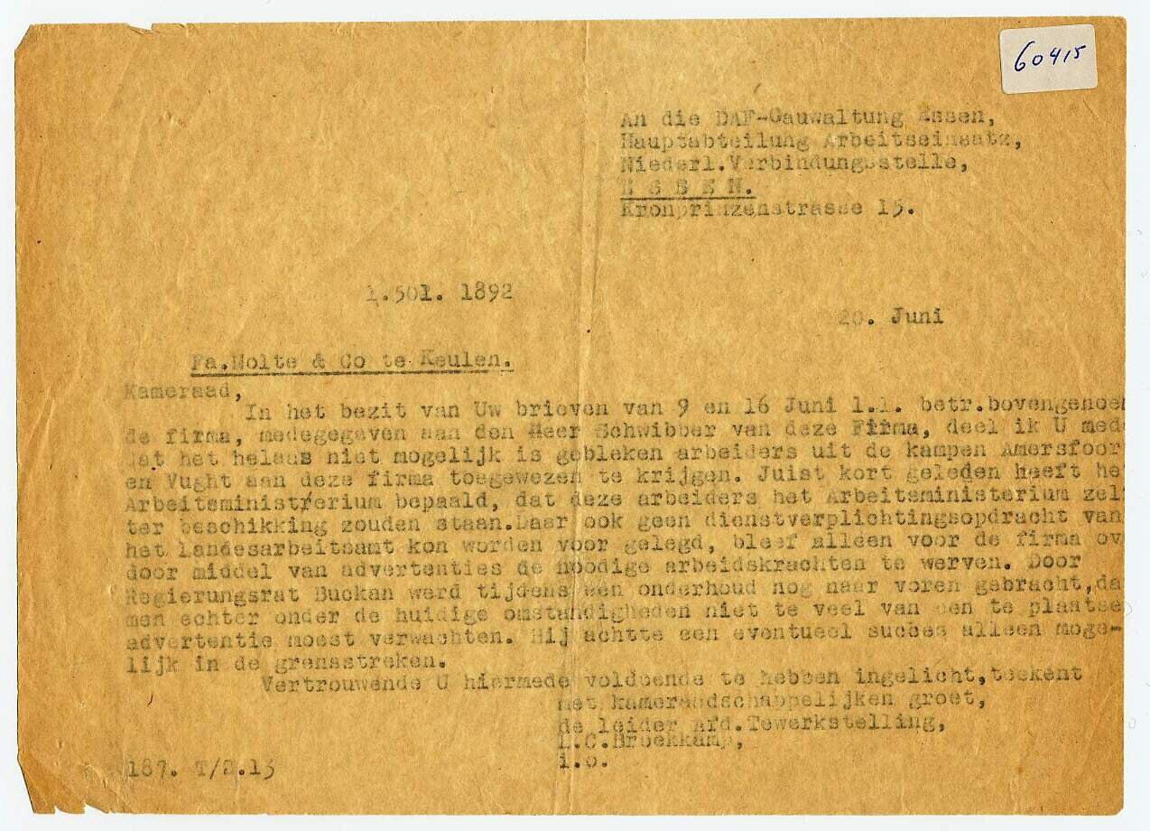 Doorslag van een Nederlandstalige brief aan de DAF-Gauwaltung Essen, Hauptabteilung Arbeidseinsatz, gedateerd 20 juni, naar aanleiding van een verzoek van de Fa. Nolte & co. te Keulen, met daarin het bericht dat "het helaas niet mogelijk is gebleken arbeiders uit de kampen Amersfoort en Vught aan deze firma toegewezen te krijgen".