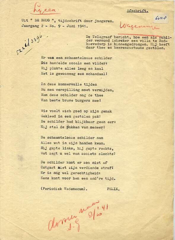 Een gestencild gedicht geschreven naar aanleiding van een bericht in de Telegraaf: "Hoe een als schilder vermomd inbreker een villa te Badhoevedorp is binnengedrongen. Hij heeft daar thee en heerencostuums gestolen". Het gedicht is afkomstig uit "De Brug", tijdschrift door jongeren, jaargang 2 - No. 9 - Juni 1941", ondertekend Felix. In rood is er onder andere Wageningen opgeschreven.