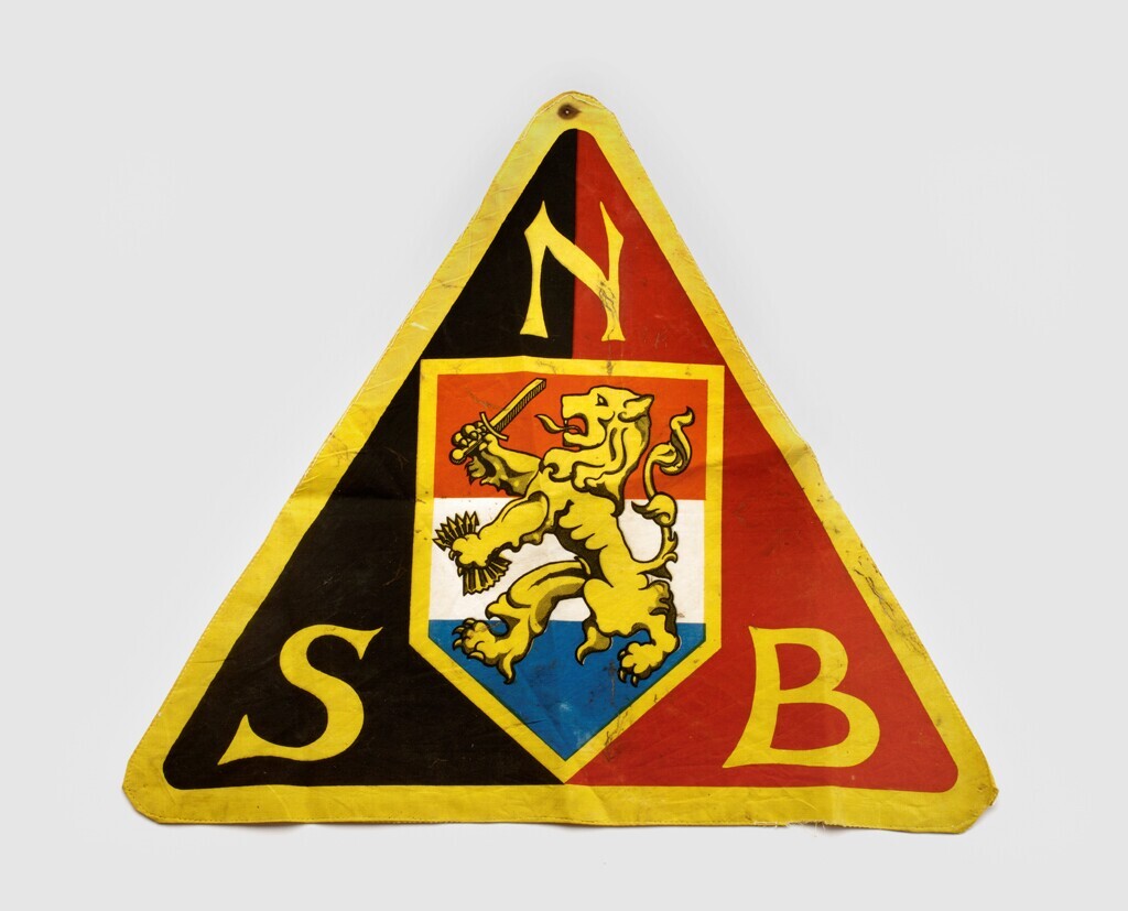 Twee katoenen driehoekig emblemen met 'gouden' rand van de N.S.B.: op een rood en zwart veld de 'gouden' letters van de beweging rondom een wapenschild met klimmende Nederlandse leeuw tegen de achtergrond van de kleuren van de prinsenvlag: oranje, blanje, blue.