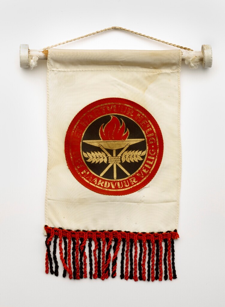 Een wit kunstzijden vaantje bedrukt met het ronde embleem van de Nationaal-Socialistische Vrouwenorganisatie van de N.S.B.: binnen een rood medaillon op een zwart veld een goudkleurige standaard met een rode vlam. Op de rand van het medaillon in gouden letters: "Het hartvuur heilig, het haardvuur veilig". Het vaantje heeft aan de onderkant rood en zwart franje en is aan de bovenkant bevestigd aan een wit geverfd houten stokje met wit touwtje om het vaantje aan op te hangen.