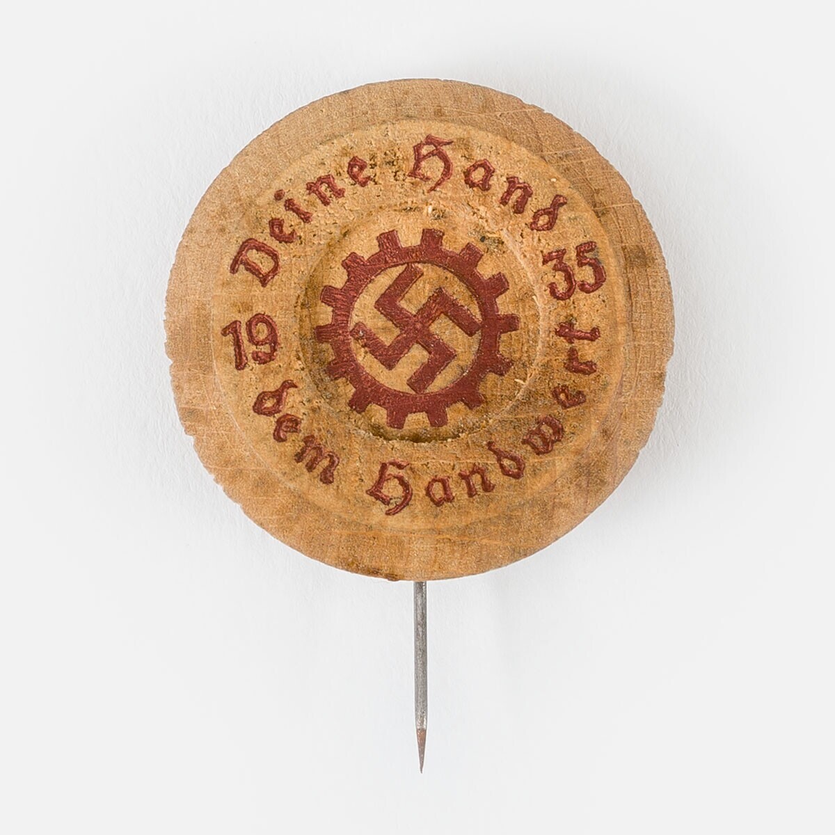 Een metalen NSB-speldje met bovenaan in reliëf: "Goudsberg", hieronder: "Vrijheid en recht 1940". Geheel rechts een ontbloot zwaard met langs de zijkant: "NSB". Midden onder een bezem die de symbolen van de tegenmachten wegveegt: Frygische muts en kruis. Daaronder: "Ongerechtigheid". Herinneringsspeld van de in de openluchtbijeenkomst van de NSB: 5e Hagespraak “Vrijheid en Recht” op de Goudsberg te Lunteren op 22 juni 1940.