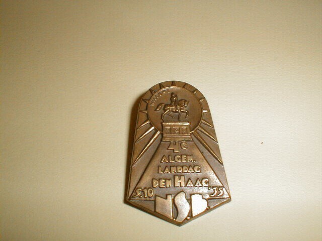 Een 'Herdenkingsspeld Algemeene Landdag NSB Den Haag 1935' van bronskleurig metaal met bovenaan in een medaillon omgeven door stralen de afbeelding van het ruiterstandbeeld van Willem I zoals dat te vinden is voor paleis Noordeinde in Den Haag. Daaronder: "4e algem. Landdag Den Haag". Geheel onder: "5.10 '35 N.S.B."