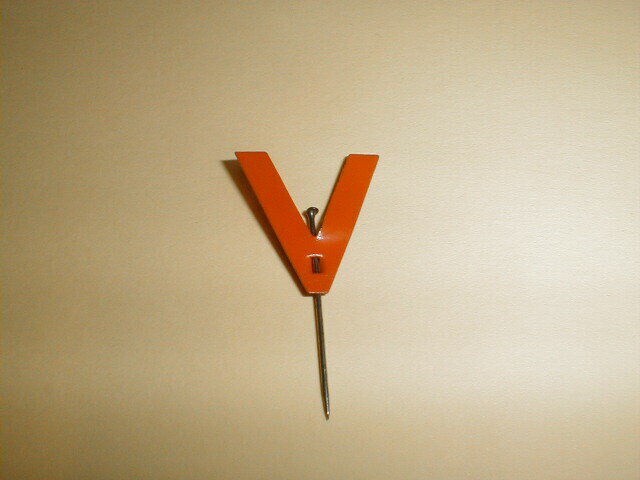 Een metalen oranje geverfd speldje in de vorm van de letter V. Dit speldje was propagandamateriaal voor de Duitse V-actie: 'V=Victorie, want Duitsland wint voor Europa op alle fronten' in de zomer van 1941 als reactie op de Britse V van 'Victory' dat als teken van verzet in de door Duitsland bezette gebieden vanaf het voorjaar van 1941 op allerlei manieren werd geuit.