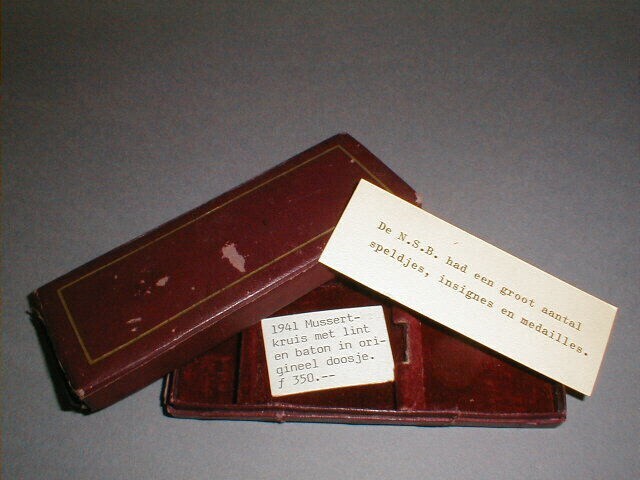 Een geëmailleerde messing medaille aan een lint met banen in de kleuren van de Prinsenvlag: blauw, wit en oranje, compleet met baton in dezelfde kleuren en in de originele doos. Het gaat om het 'Mussertkruis': op de voorzijde een rood achtpuntig kruis met zwarte randen. Daarop twee gekruiste zwaarden en daarop een rond medaillon met op een witte achtergrond een gouden hakenkruis met wolfsangel en daaronder eikenbladeren. Op de achterzijde in het medaillon in gouden letters: "Mussert 1941" en daaromheen de tekst: "Hou en Trouw" en onderaan eveneens eikenbladeren. De baton is voorzien van twee geruiste messing zwaarden. De onderscheiding is ingesteld in 1941 door Mussert leider van de N.S.B. voor Nederlandse Oostfrontstrijders in dienst van de Waffen-SS. Dezen hebben het nooit ontvangen aangezien het door het Duitse gezag niet werd erkend.