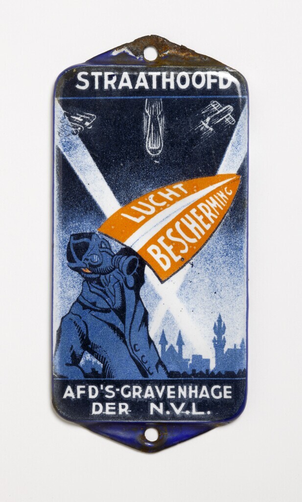 Een blauw geëmailleerd metalen plaatje met de afbeelding van een man met gasmasker die zich afschermt met een oranje schild waarop: "Luchtbescherming". Bovenaan het plaatje: "Straathoofd" en onderaan: "Afd. 's- Gravenhage N.V.L". Onder en boven is het plaatje voorzien van een gaatje om het plaatje bij of op een deur te kunnen schroeven van het desbetreffende straathoofd.