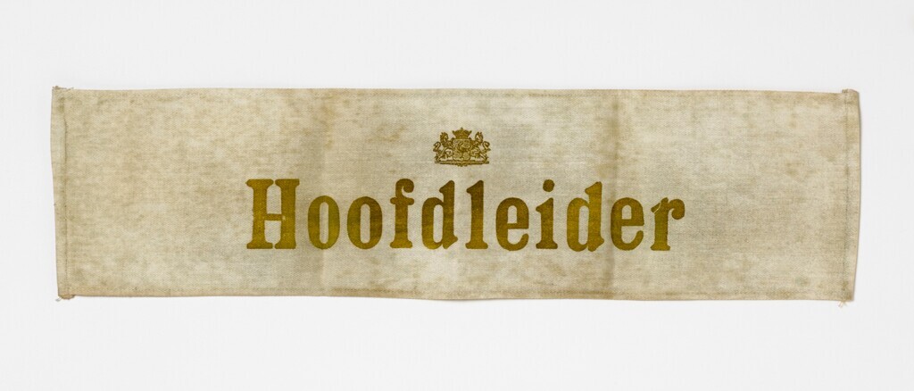 Een wit katoenen mouwband met gee-groene opdruk: "Hoofdleider" en wapen van Den Haag.