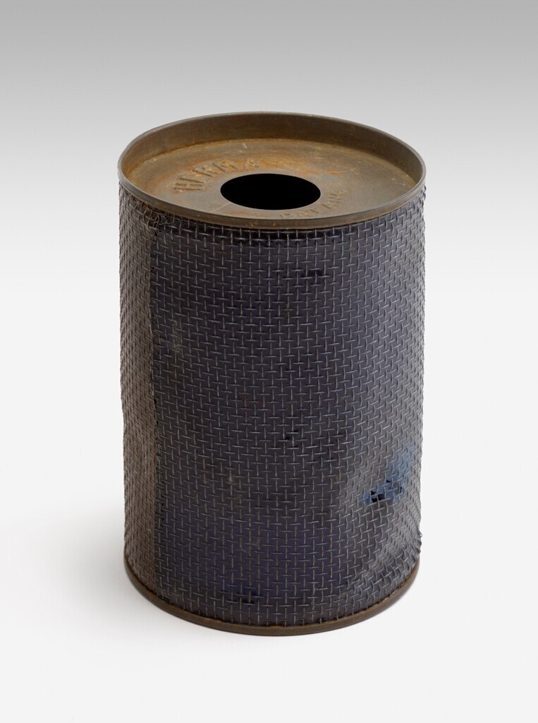 Een cilindrische ijzeren lampenkap van blauw en zwart plastic gevat in een houder van ijzeren gaas. Aan onderzijde twee beugels voor de lamp. Aan de bovenkant gesloten op een cirkelvormig gat na. Op deze bovenkant: "HERMA pat.ang."