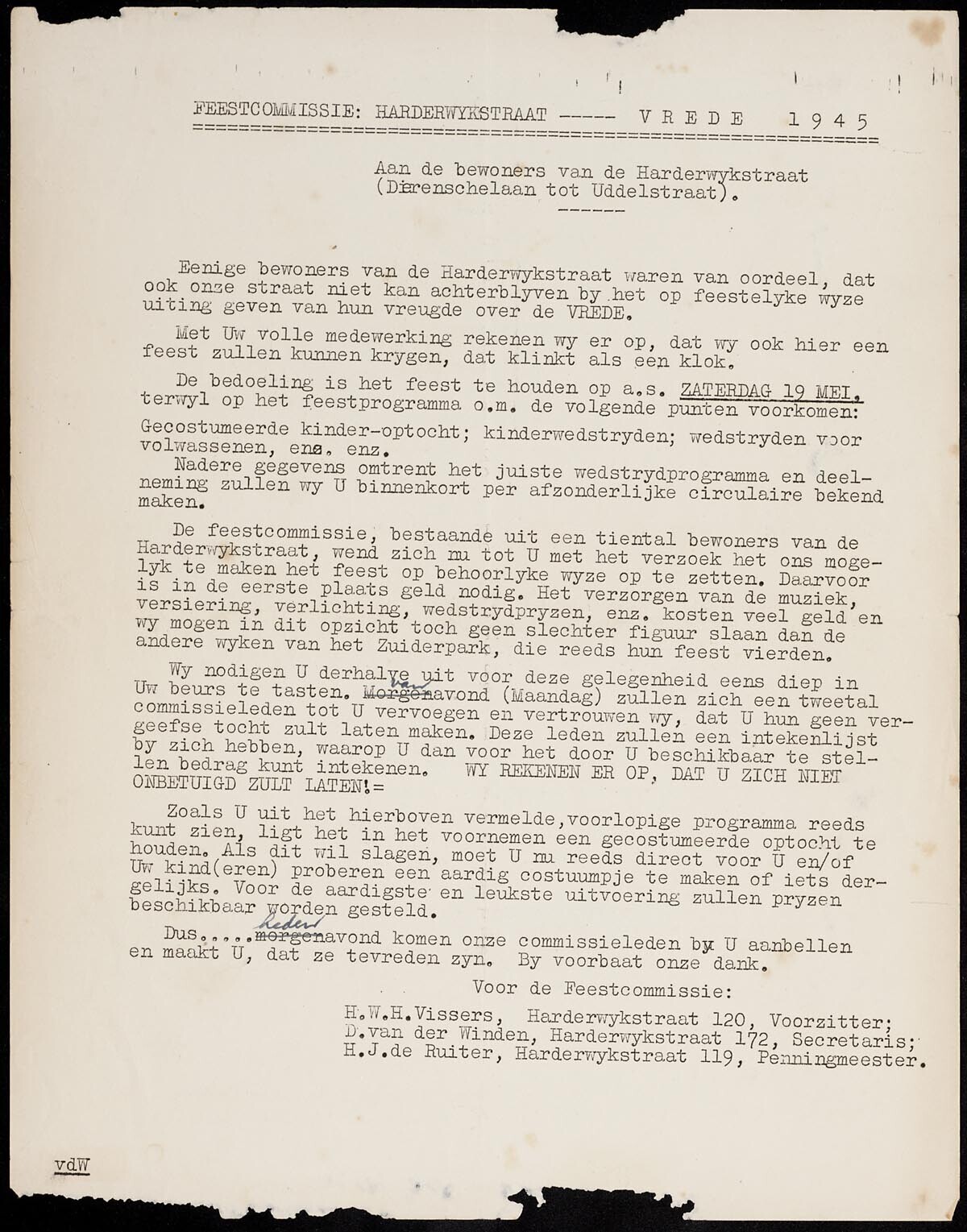 Drie stencils over de organisatie van een bevrijdingsfeest op 19 mei 1945 in de Harderwijkstraat in Den Haag.