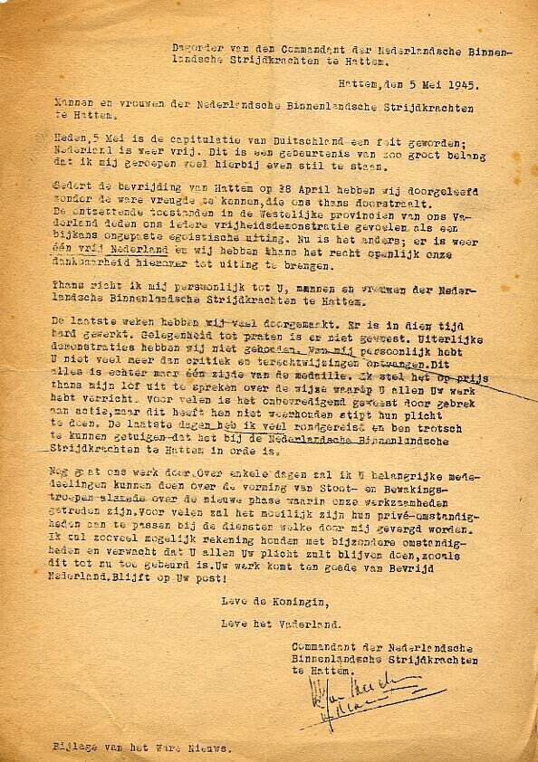 Dagorder van de commandant der Nederlansche Binnenlandsche Strijdkrachten te Hattem op 5 mei 1945.