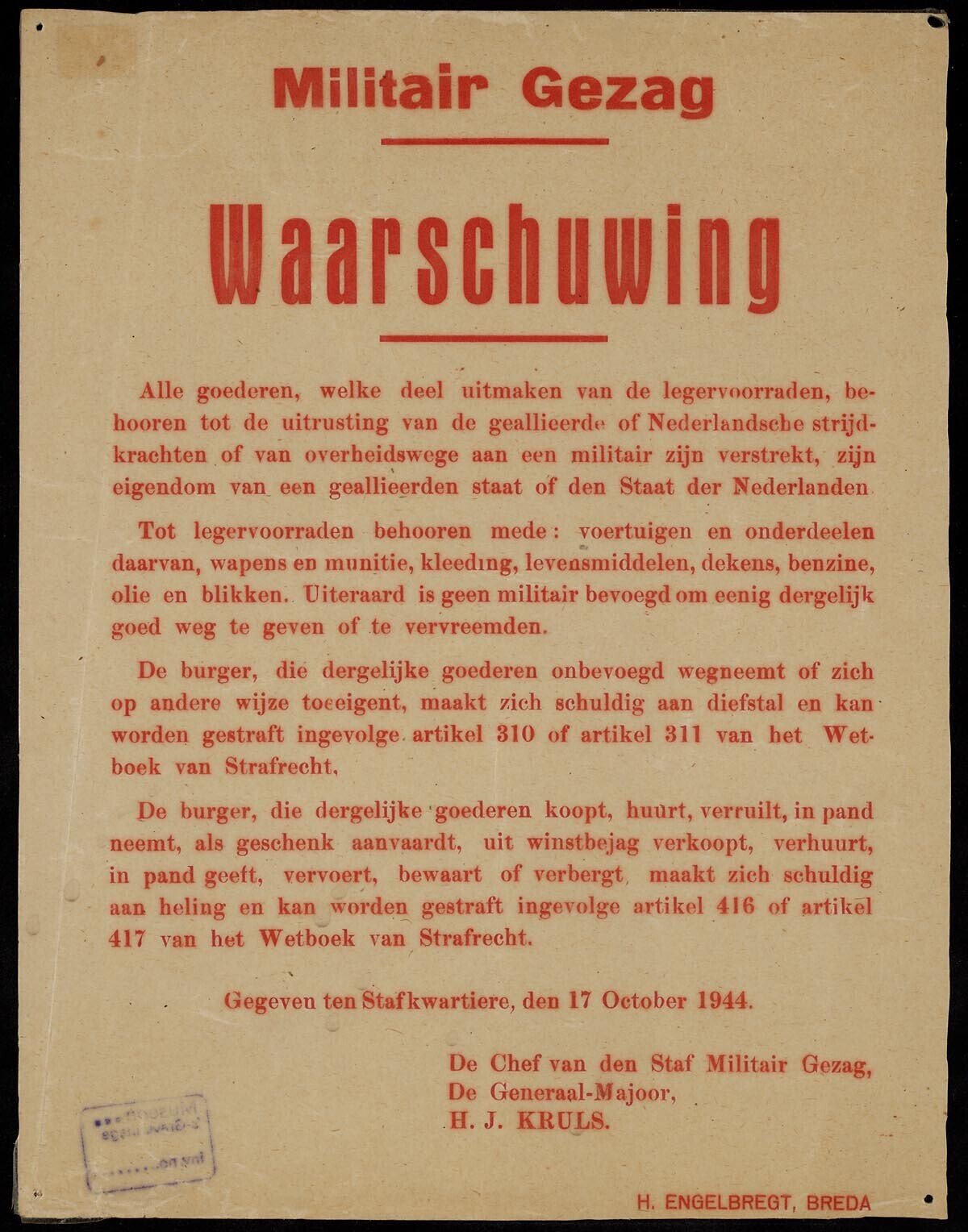 Rood gedrukt pamflet met een waarschuwing inzake onwettige toe-eigening van legervoorraden.