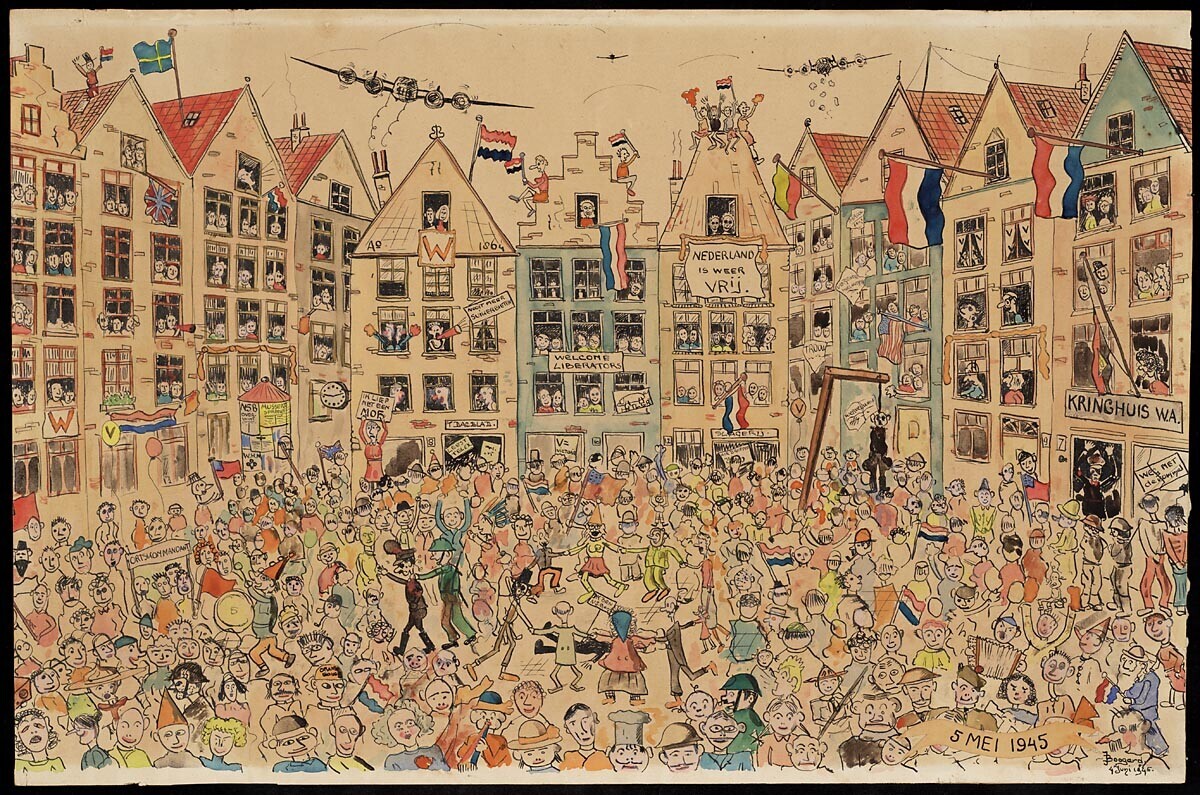 Een gekleurde pentekening van een plein met feestvierende mensen naar aanleiding van de bevrijding. Diverse leuzen zijn in de tekening verwerkt. o.a.: "Nederland is weer VRIJ, Nooit meer suikerbieten, Welcome Liberators, Ik liep met een MOF en Ik ben een NSBer" draagt men nee.