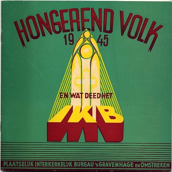 Verslag van het werk van het I.K.B. over het jaar 1945. De kaft is groen met een gele afbeelding van een gotisch venster met kruis, met daaronder de letters I.K.B. Het boek omvat 47 pagina's.