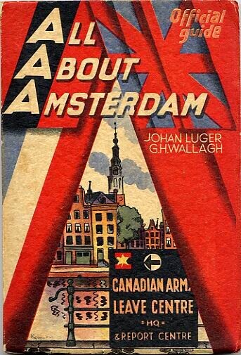 Toeristische boek over Amsterdam speciaal geschreven voor Canadese troepen. Bevat striptekeningen en achterin een plattegrond van Amsterdam. Rood-witte kaft met een tekening van een doorkijkje op een gracht met een kerk tussen Canadese en Nederlandse vlag.