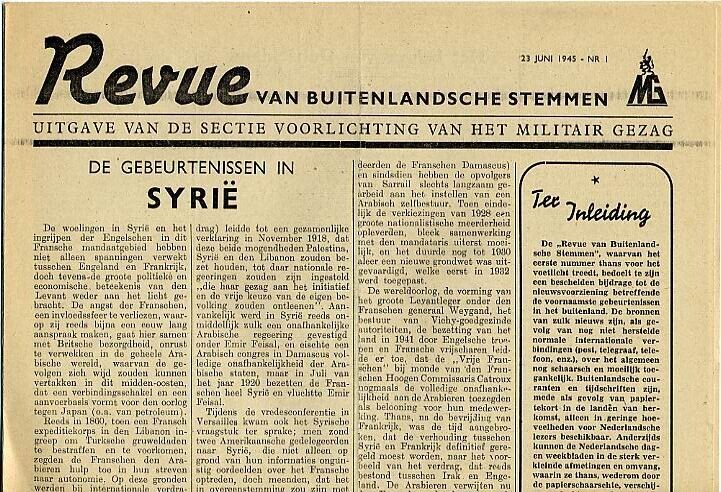 Vijf uitgaven van de "Revue van buitenlandse stemmen. Uitgave van de Sectie Voorlichting van het Militair Gezag". Het gaat om nummer 1 van 23 juni 1945, nummer 2 van 30 juni 1945, nummer 10 van 25 augustus 1945, nummer 11 van 1 september 1945 en nummer 12 van 8 september 1945. Het nieuws in de uitgaven is ontleend aan andere nieuwsbladen.