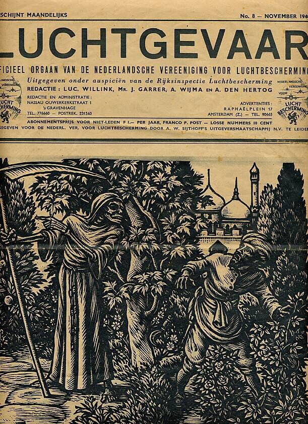 Tijdschrift van de Nederlandsche Vereeniging voor Luchtbescherming. Het betreft nummer 8 van november 1940. Op de voorzijde een afbeelding van een houtsnede van Nico Bulder naar het gedicht "De Tuinman en de Dood" van P.N. Van Eyck.