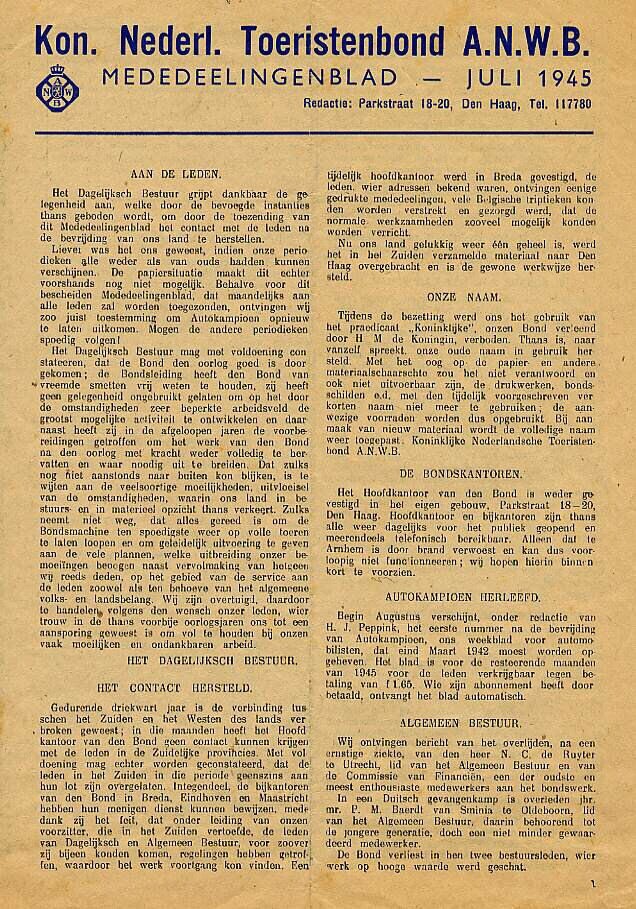 Mededelingenblad van de A.N.W.B. Het exemplaar van juli 1945 bestaat uit vier pagina's. Binnenin een waarschuwing: Blijft op paden en wegen. Denkt aan 't mijnengevaar!