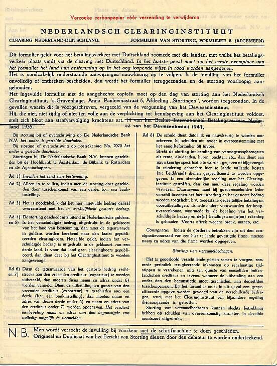 Blanco formulieren met toelichting over de regeling van het betalingsverkeer tussen Nederland en Duitsland van het Nederlandsch Clearinginstituut. En een blanco aanvraagformulier tot na-inlevering van valuta.
