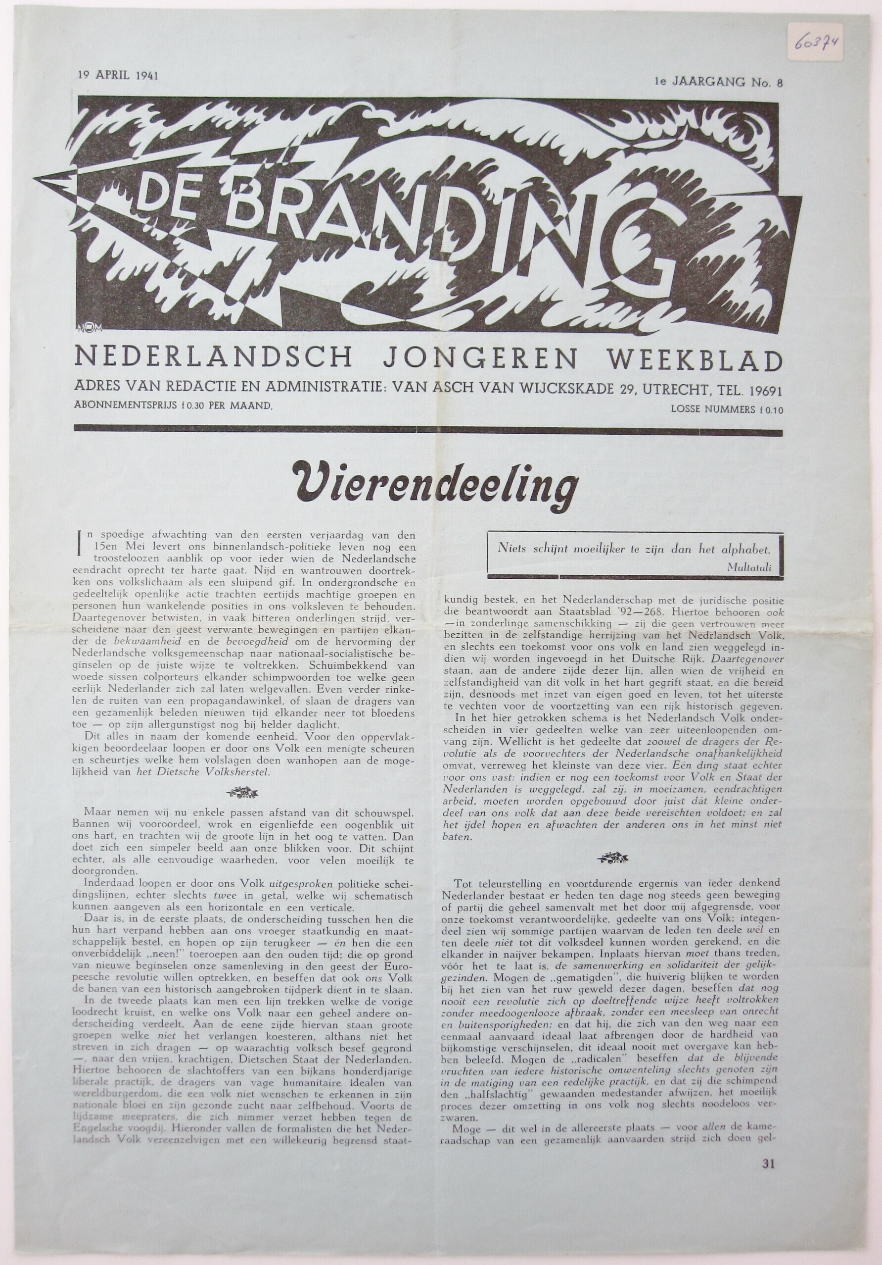 Exemplaar van "De Branding, Nederlandsch Jongeren Weekblad", eerste jaargang nummer acht. Het weekblad telt vier pagina's en is gedrukt op blauw papier. Bovenaan op de voorpagina is een tekening van de branding gedrukt met daarin de titel van het blad. In het blad artikelen over staat- en volkshuishouding en het Dietsch bewustzijn.