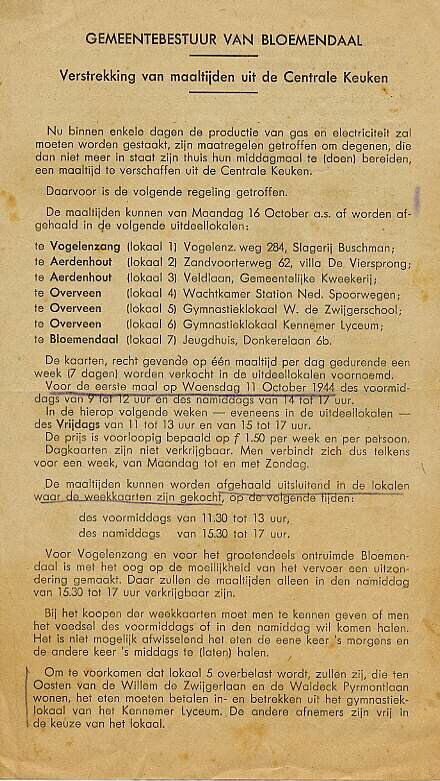 Mededeling over de verstrekking van maaltijden uit de centrale keuken te Bloemendaal vanaf 16 oktober 1944.