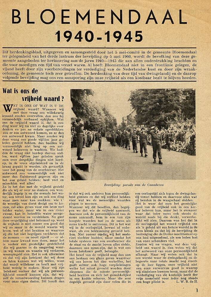 Herdenkingsblad uit 1960 over de gebeurtenissen in de gemeente Bloemendaal tijdens de oorlog. Op de voorpagina een foto van een parade van de Canadezen. De uitgave omvat 12 pagina's.