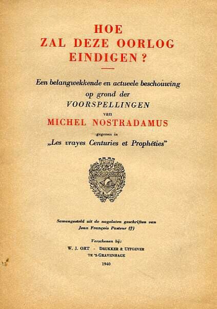 "Verleden, Heden en Toekomst". Op wonderbaarlijke wijze voorspeld door den Franschman Michel Nostradamus in zijn "Les vrayes Centuries et Prophéties". Deze boek is samengesteld uit de nagelaten geschriften van Jean François Pasteur uit het jaar 1688. Beige omslag met een afbeelding van het Wapen van Parijs, op bladzijde 7 is een portret afgedrukt van Michel Nostradamus. Het boekje bestaat uit 46 bladzijden. Er zijn 2 identieke exemplaren.