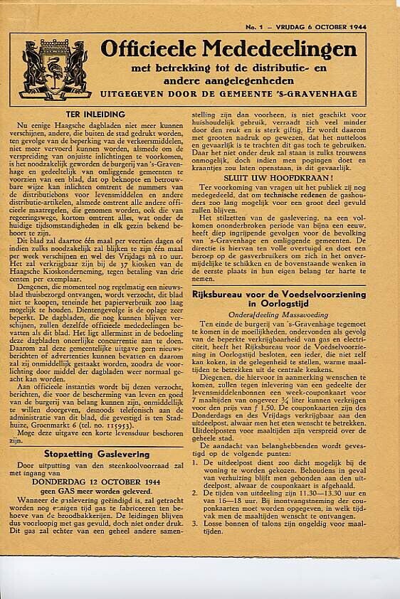Vijf exemplaren van 'Officiële Mededeelingen met betrekking tot de distributie- en andere aangelegenheden' uitgegeven door de gemeente ‘s-Gravenhage. Het gaat om nummer 1 van vrijdag 6 oktober, twee exemplaren van 13 oktober en twee exemplaren van 20 oktober 1944.