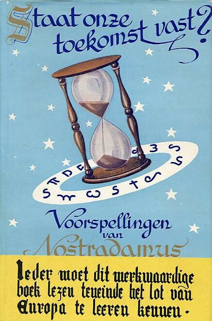 Een boekje getiteld "Staat onze toekomst vast? Voorspellingen van Nostradamus uit het jaar 1558 over het verloop van den huidige oorlog". Op een gele banderolle staat vermeld: "Ieder moet dit merkwaardige boek lezen teneinde het lot van Europa te leeren kennen". Het boekje heeft een lichtblauwe omslag met een afbeelding van een zandloper. Het telt 99 bladzijden.