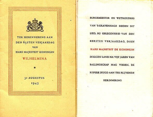 Een anoniem gedicht uit de bezettingstijd, in de vorm van het Wilhelmus. Op de voorpagina is de titel rood omkaderd, met bovenaan de Nederlandse leeuw, op de achterzijde het wapen van Den Haag. Op de eerste pagina een foto van Koningin Wilhelmina.