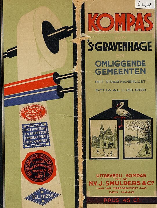 Plattegrond van Den Haag en omliggende gemeenten van uitgeverij Kompas. Op het voorblad in rood het woord 'Kompas' en op een groene achtergrond de afbeeldingen van de Ridderzaal en de Hofvijver met daarboven de ooievaar van Den Haag. Aan de achterzijde een reklame van de etikettenfabriek 'Rex' te Den Haag.