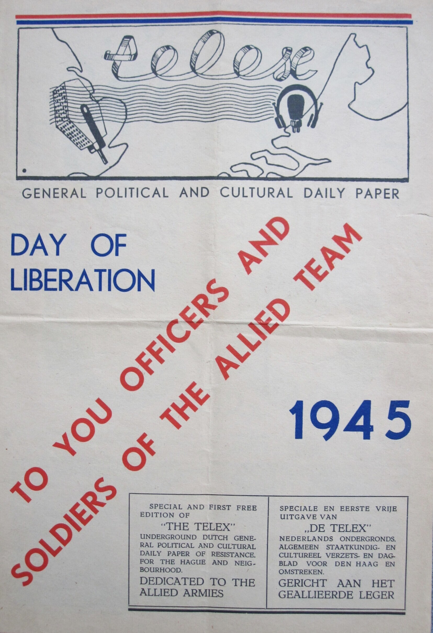 Bevrijdingsuitgave gericht aan het geallieerde leger. Bovenaan de titel van het blad gevat in een tekening die de telex verbinding tussen Engeland en Nederland symboliseerd. In oranje drukletters diagonaal over de voorpagina de tekst: 'To you officers and soldiers of the allied team' Op het binnenblad de afbeeldingen van diverse generaals en staatshoofden.