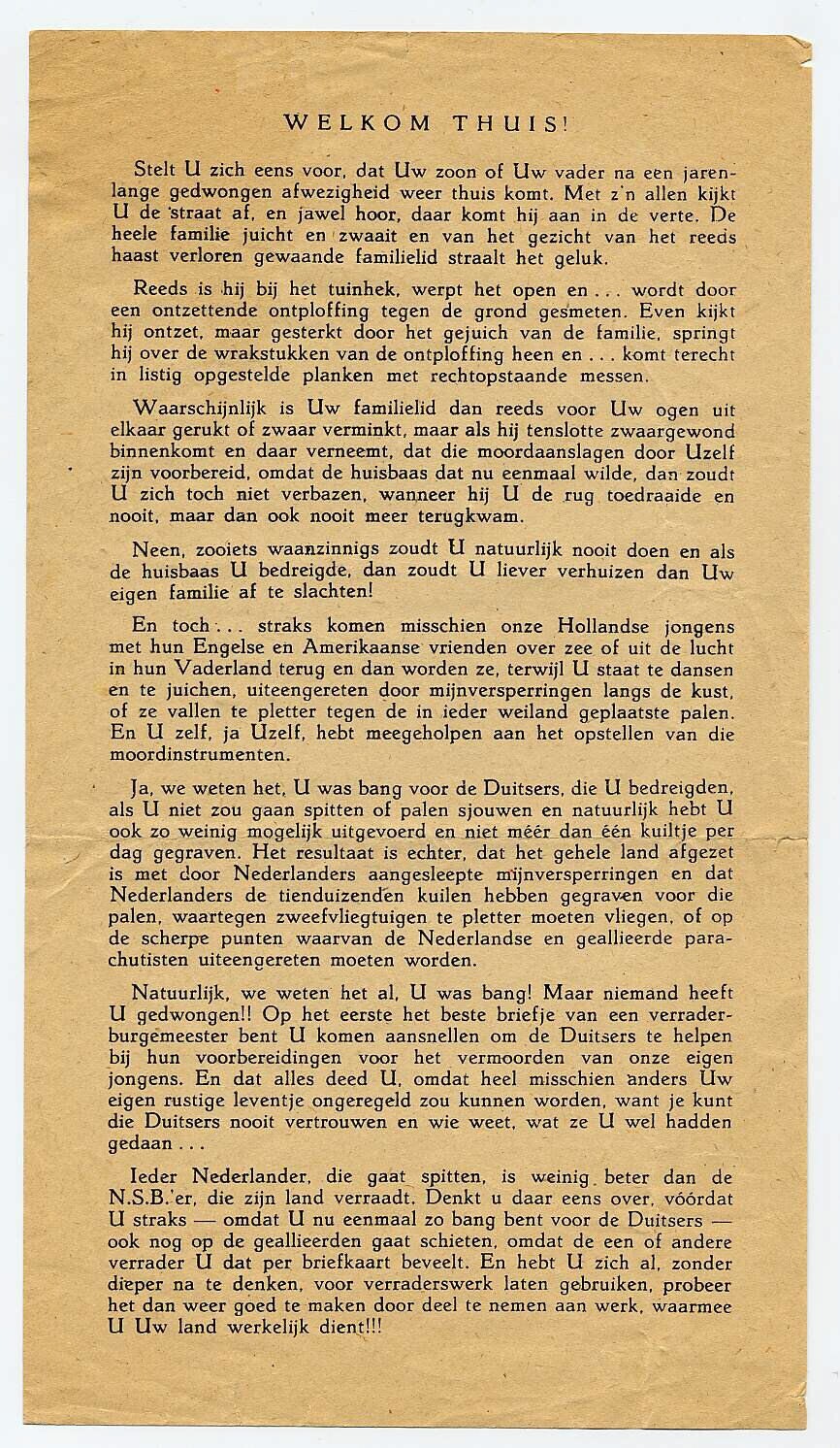 Blad met gedrukte tekst, bedoeld als oproep om niet voor de Duitsers te werken: "Straks komen misschien onze Hollandse jongens met hun Engelse en Amerikaanse vrienden over zee of uit de lucht in hun Vaderland terug en dan worden ze, terwijl U staat te dansen en te juichen, uiteengereten door mijnversperringen langs de kust, of ze vallen te pletter tegen de in ieder weiland geplaatste palen. En U zelf, ja Uzelf, hebt meegeholpen aan het opstellen van die moordinstrumenten."