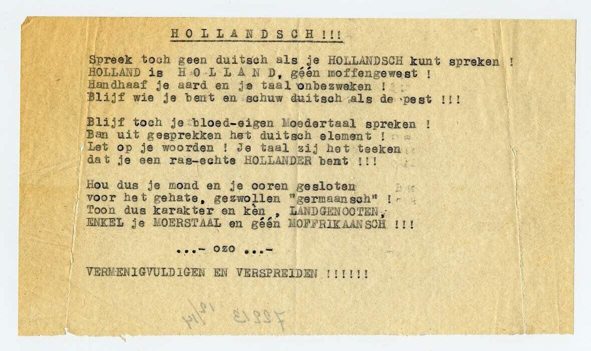 Gestencild gedicht, gericht tegen het gebruik van de Duitse taal. Eronder de letters "OZO" (Oranje zal overwinnen) en de oproep het gedicht te vermenigvuldigen en te verspreiden.