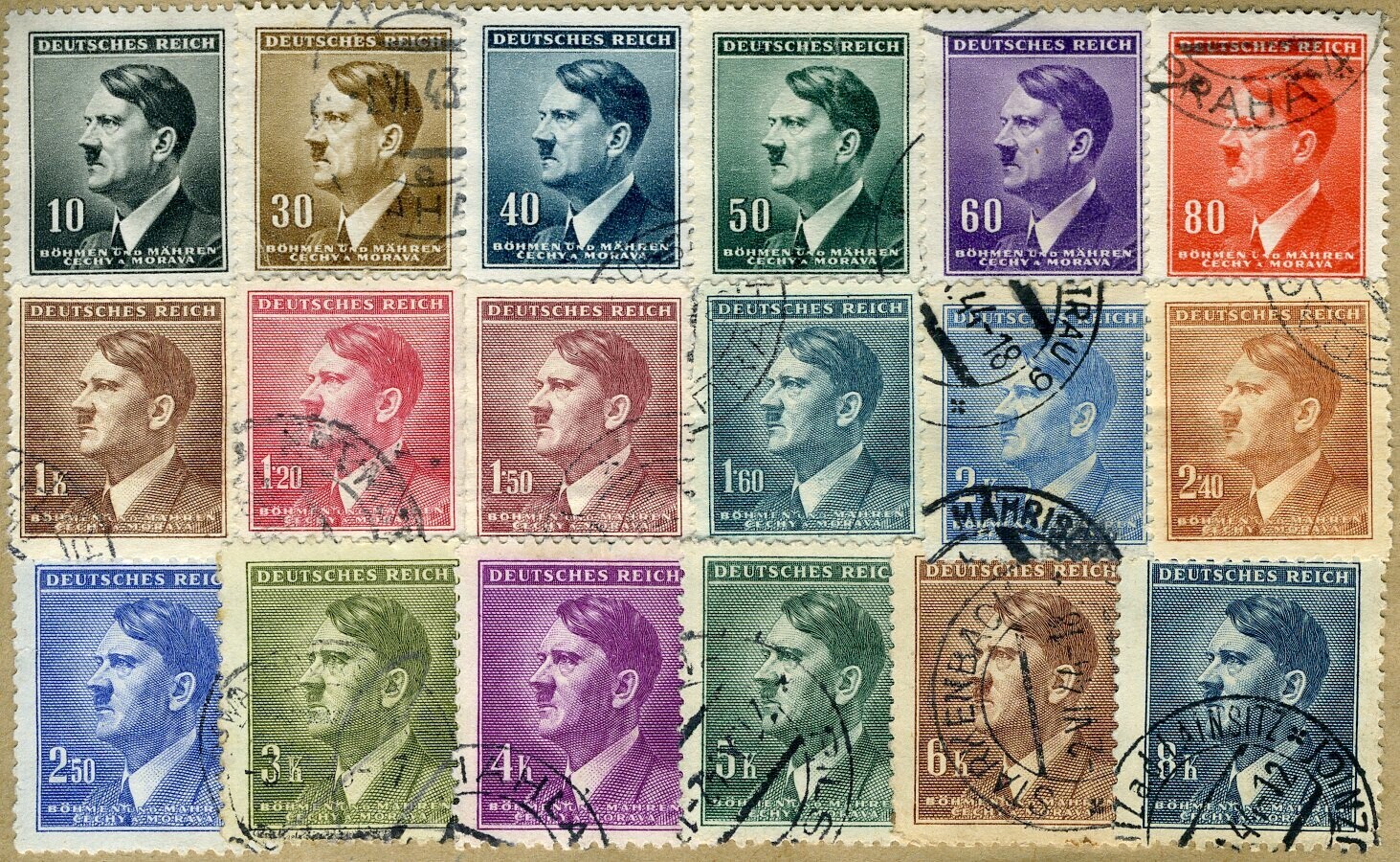 Achttien postzegels uit Tsjechoslowakije, met daarop een afbeelding van Hitler.