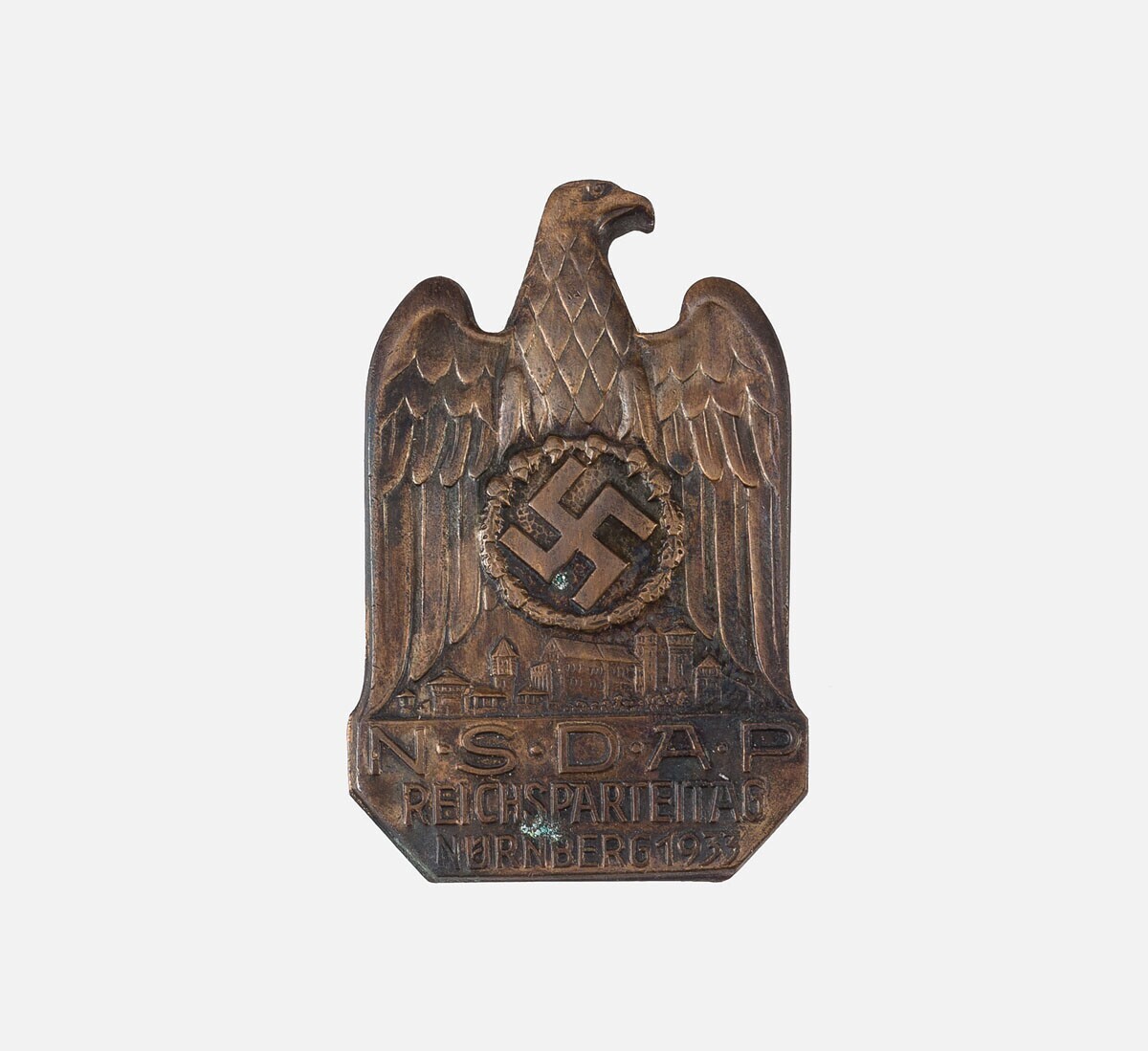 Een bronskleurige metalen reversspeld met boven een stadsgezicht de afbeelding van de Rijksadelaar met in de klauwen in een rond medaillon een hakenkruis. Hieronder: "N.S.D.A.P. Reichsparteitag Nurnberg 1933". Het is een "Buntmetall" (non-ferrometaal) speld van de eerste Reichsparteitag gehouden te Neurenberg in 1933.