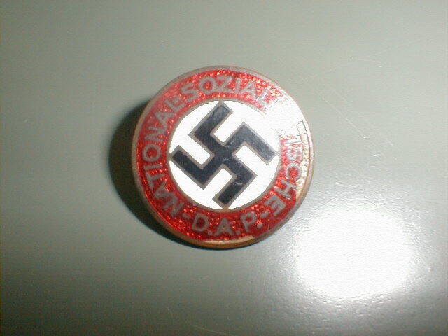 Een insigne van geëmailleerd goudkleurig metaal. In het midden op een rond wit veld een zwart hakenkruis. Langs de rand een rode band met daarin uitgespaard: "National-Sozialistische-D.A.P." Op de achterkant: "G.E.S. G.E.S.C.H."