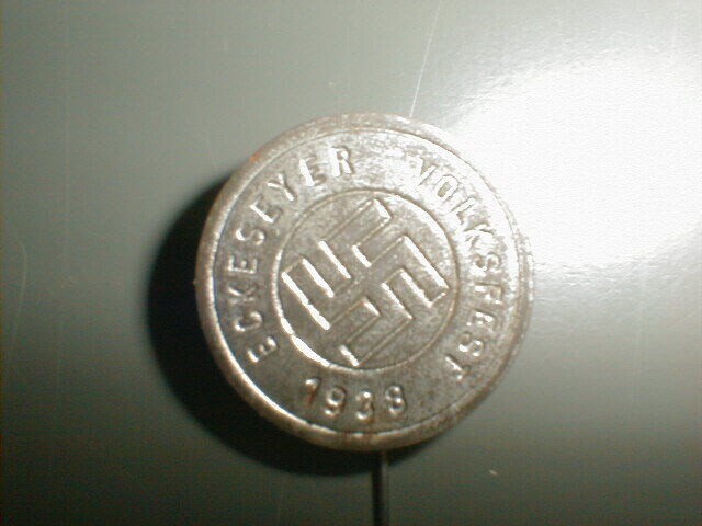 Een rond tinnen Nationaal Sozialistische Deutsche Arbeiter Partei (NSDAP) speldje met daarin gestanst in het midden een hakenkruis met daaromheen: "Eckeseyer Volksfest 1938".
