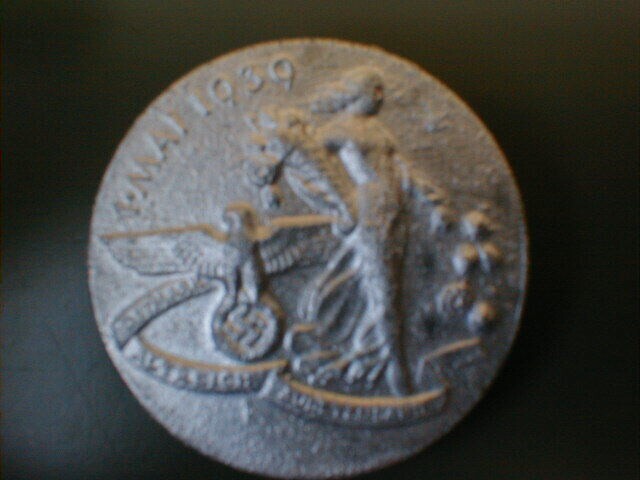 Een rond zilverkleurig metalen speldje uitgegeven ter gelegenheid aan de Dag van de Arbeid. In reliëf een vrouw met bloemhulde en links van haar de Rijksadelaar met in de klauwen het hakenkruis. Onder deze afbeeldingen op een band: "Ostmark, Altreich, Sudetenland". Bovenaan langs de rand: "1 Mai 1939".